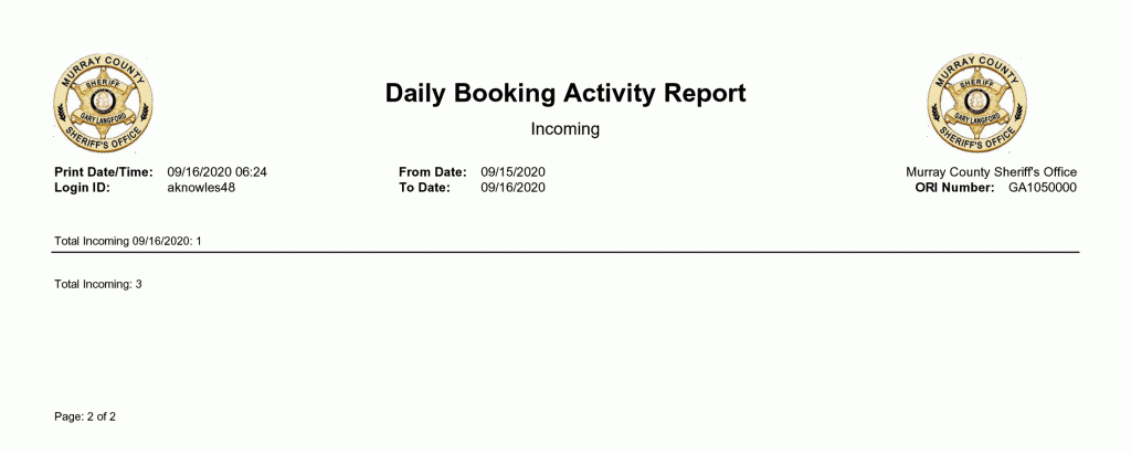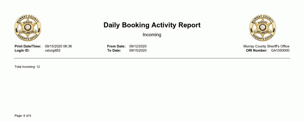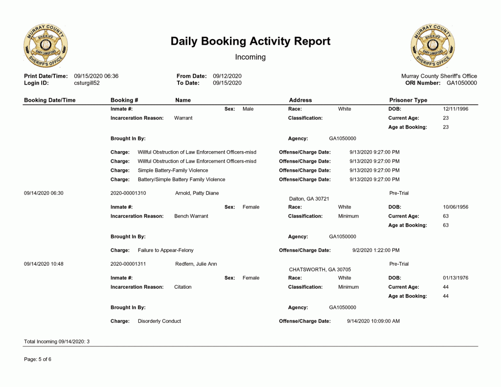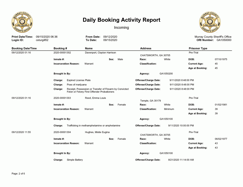 Murray County Sheriffs Office Arrest Report 9/13 – 9/20